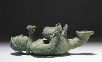 Keywords: Meroitic - Oil Lamp with Bound Prisoner - Walters 541549 - Side A.jpg Elaborate oil lamps with figural attachments were common at the royal court in the ancient kingdom of Meroë This lamp depicts a captive nude prisoner his hands bound to his ankles The lamp would have been suspended by a chain from the collar around the figure's neck A Meroitic symbol perhaps an owner's mark is incised on the prisoner's shoulders between 700 200 BC bronze W 4 1/8 x D 3 9/16 x L 10 in 10 4 x 9 x 25 4 cm accession number 54 1549 11681 Guilhou Sale 1905 lot 307 said to be found in Egypt Henry Walters city Baltimore Walters Art Museum Henry Walters Acquired by Henry Walters 1905 place of origin Egypt Walters Art Museum license Ancient Egyptian art in the Walters Art Museum Meroitic art Archaeological bronze objects Ancient oil lamps POWs in Ancient Egypt