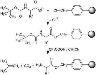 Keywords: Merrifield Synthesis 1 V.1.svg en Merrifield_Synthesis_1 de Merrifield_Synthese_1 own Jü 2010-07-16 Peptide synthesis