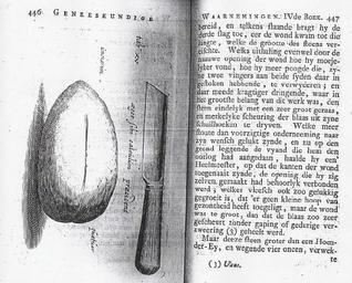 | Keywords: Mes-jan-de-doot.JPG Scanned page showing the knife of Jan de Doot and the kidney stone he removed with said knife from his own kidney with the help of his brother in the 17th century This story is described in the book Observationes Medicae by Nicolaes Tulp Full Dutch story accompanying the picture Waarneemingen IXde Boek eenendertigste Hoofdstuk Een zieke zig zelven van den Steen Snydende Joannes Lethaus een Smit een moedig Man en van eene ongehoorde stoutheid wien de Steensnyder tweemaal den steen had afgnomen had zoo veel tegenzin in zyne dagelyksche rampen en herhaalde snyding dat hy ten derden male van denzelfden beul gepynigt zynde liever aan allerhande gevaren wilde onderworpen worden dan het mes des steensnyders wederom te beproeven Hebbende dan zyn moed opgebeurt met de hoop van de herstelling zyner gezontheid en nu vastgestelt hebbende met niemands tusschenkomst zig zelven te snyden; zond hy zyne Huisvrouw geen erg daar in hebbende naar de Vismarkt; en het Sakje Scrotum pgeschort zynde van zyn broeder die alleen by het werk tegenwoordig was en de steen met zyn linkerhand vastgehouden hebbende sneed hij moedig in de bilnaad Perineum met een mes heimelyk van hem bereid en telkens staande bragt hy de derde slag toe eer de wond kwam tot die langte welke de grootte des steens vereischte welks uithaling evenwel door de nauwe opening der wond hoe hy moejelyker vond hoe hy meer poogde die zyne twee vingers aan beide syden daar in gestoken hebbende te verwyderen; en daar meede kragtiger dringende waar in het grootste belang van dit werk was den steen eindelyk met een zeer groot geraas en merkelyke scheuring der blaas uit zyne schuilhoeken te dryven Welke meer stoute dan voorzigtige onderneming naar zyn wensch gelukt zynde en nu op den grond leggende de vyand die hem den oorlog had aangedaan haalde hy een Heelmeester op dat de kanten der wond toegenaait zynde de opening die hy zig zelven gemaakt had behoorlyk verbonden werd; welker vleesch ook zoo gelukkig gegroeit is dat 'er geen kleine hoop van gezontheid heeft toegeligt maar de wond was te groot dan dat de blaas zoo zeer gescheurt zonder gaping of gedurige verzweering Ulcus geheelt werd Maar deze steen groter dan een Hoender-Ey en wegende vier oncen verwekte des te meer verwondering hoe ze gelukkiger voor den dag kwam alleen door behulp der hand zonder de vereischte werktuigen en dan van den zieke zelve die al zyn hulp alleen had in de stoutheid gelyk de vertrouwendheid alleen in de ongeduldigheid in welke waarlyk ontoegankelyk vertrouwen eener opgebeurde moed gelyk hy niemand week zoo was hy ook geensins minder dan die geenen wier standvastigheid de gedenkschriften der ouden fraay opschikken Zoo helpt somtyds de onbezonnenheid dien de reden niet helpt Geneeskundige Waarnemingen van Nikolaas Tulp Oud Burgermeester der stad Amsterdam Naar den zelfden Druk uit het Latyn vertaalt Te Leiden By Juriaan Wishoff 1740 1740 Nikolaas Tulp PD-old-100 Original manuscript from 1640 'Observationes Medicae' in Latin http //www unesco org/webworld/mdm/visite/vilnius/knygos/knygos/medicina/tulpe/anglu/emtulpe htm PD-old-100 Medical book covers Nicolaes Tulp Kidney stones Observationes Medicae 1740 by Nicolaes Tulp Jan de Doot |