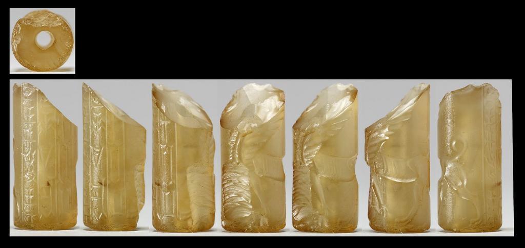 Keywords: Mesopotamian - Cylinder Seal with Human Headed Winged Bull and Inscription - Walters 42808 - View A.jpg This scene on this seal depicts a human headed winged lion wearing a horned crown with an inverted crescent in the field above him The scene also incorporates a cuneiform inscription in three registers late 2nd millenium BC Neo-Babylonain ; Assyrian yellow transparent stone cm 2 4 0 9 accession number 42 808 4549 Sadie Jones Mrs Henry Walters New York date and mode of acquisition unknown Sale Joseph Brummer New York 1941 Walters Art Museum 1941 by purchase Museum purchase 1941 Inscription place of origin Mesopotamia Walters Art Museum license Cylinder seals in the Walters Art Museum Art of Mesopotamia in the Walters Art Museum Lions in art of the ancient Near East Cuneiform on cylinder seals Cuneiform on media Griffin cylinder seal Walters 42808 Walters Art Museum cylinder seals with cuneiform Animals in art of the ancient Near East Pa cuneiform An cuneiform Media contributed by the Walters Art Museum needs category review |