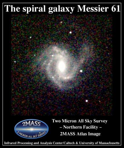 | Keywords: Messier 061 2MASS.jpg The spiral galaxy Messier 61 http //www ipac caltech edu/2mass/gallery/messiercat html 2MASS Atlas Image Gallery The Messier Catalog Two Micron All Sky Survey 2MASS a joint project of the University of Massachusetts and the Infrared Processing and Analysis Center/California Institute of Technology funded by the National Aeronautics and Space Administration and the National Science Foundation 2MASS Atlas image Messier 61 2MASS Atlas Image Gallery The Messier Catalog BIG SIZE |