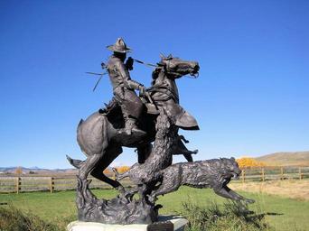 Keywords: metal sculpture coyotes horse cowboy alberta canada