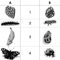 | Keywords: Metamorphosis of butterfly and beetle.png en Metamorphosis of peacock butterfly and lady beetle cs Příklady proměny dokonalé<br> A nejtypičtější zástupce proměny dokonalé - motýl babočka paví oko <br> B zástupce z řad brouků slunéčko sedmitečné <br> 1 - stadium vajíček; 2 - A housenka B larva; 3 - kukla; 4 - imago own ListickaFox 2015-09-05 Metamorphosis biology Cc-zero | ||||