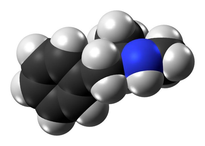 Keywords: Methamphetamine molecule from xtal spacefill.png Space-filling model of the methamphetamine molecule also known as meth a powerful stimulant drug Based on the crystal structure of methamphetamine hydrochloride also known as crystal meth as determined by X-ray diffraction Color code 505050 Carbon C black<br> F0F0F0 Hydrogen H white<br> 3C50FA Nitrogen N blue<br> B42814 Bromine Br red-brown<br> 00CB00 Barium Ba green<br> 2015-01-21 own Crystallographic data from P Hakey W Ouellette J Zubieta and T Korter May 2008 Redetermination of + -methamphetamine hydrochloride at 90 K http //scripts iucr org/cgi-bin/paper S1600536808011550 Acta Cryst E64 o940 DOI 10 1107/S1600536808011550 DS Visualizer Jynto talk Ball-and-stick version cc-zero Images by Jynto Methamphetamine |