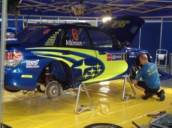 | Keywords: MEX 2008 RB 06 service 3.jpg Chris Atkinson's Subaru Impreza WRC car is serviced prior to the start of the 2008 Rally Mexico at rally base in the Poliforum in Leon Mexico Own 2008-02-27 Joshbaumgartner 2008 Rally Mexico Chris Atkinson in 2008 Subaru Impreza WRC2007 World Rally Championship automobile maintenance |
