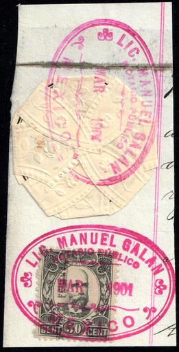 Keywords: Mexico 1901 fragment with revenue and sealing stamp.jpg en Mexico 1901 fragment with 50c revenue issued between 1900 and 1901 and sealing stamp used by notary office Catalogue stamp Forbin documents revenue 1900-1901 295 1901-03 own scan Government of Mexico See more images Mexico 1901 fragment with revenue and sealing stamp jpg Mexico 1901 fragment with revenue and sealing stamp opened jpg LangSwitch Mexico 1901 fragment with 50c revenue and sealing stamp PD-old-100 PD-Mexico Revenue stamps of Mexico 1900 stamps Seals of Mexico Business rubber stamps |