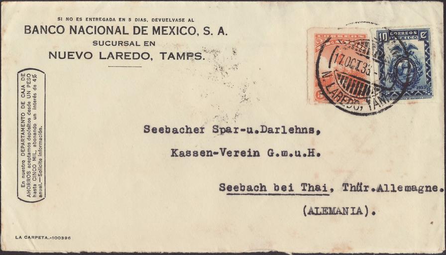 | Keywords: MexLett 1933 BoM MiNr565 665 B002a.jpg Letter of the National Bank of Mexico branch in Nuevo Laredo to Seebach in Thuringia Germany from 1933<br /> Stamp orange stamp Mexico; Michel No 565; Yvert Tellier No 426; Columbus monument; series Attractions of 1923 <br /> Stamp blue stamp Mexico; Michel No 665; Yvert Tellier No 489; commemorative stamp of 1933; emblem of the Mexican Society of Statistics and Geography<br /> Nominal value or stamp 5 Mexican Centavos<br /> Nominal value bl stamp 10 Mexican Centavos<br /> Watermark both stamps none<br /> Postmark Nuevo Laredo other date 1933-10-17 scan of original other date 1923-02 first issue of the orange stamp <br /> other date 1933-10-01 first issue day of the blue stamp <br /> other date 1933-10-17 date of postmark Banco National de Mexico sender of the letter PD-MX-exempt PD-Mexico PD-Germany-§134-KUG Philately <ins>Orange stamp</ins> Columbus monument series attractions from 1923<br /> <ins>Blue stamp</ins> Emblem of the Mexican Society of Statistics and Geography séries commemorative stamps from 1933 other date 1923-02 oragnge stamp <br /> other date 1933-10-01 blue stamp Post of Mexico stamps <br /> Banco national de Mexico sender recess printing orange + blue stamp rouletted perforation R 14½ orange + blue stamp Mexiko Nr 565 + 665 Die wirtschaftliche Rechtsform des Empfängers Verein - Gesellschaft mit unbeschränkter Haftung ist wahrscheinlich ein Vorläufer oder anderer Name des heutigen Versicherungsvereins auf Gegenseitigkeit 1923 stamps of Mexico 1933 stamps of Mexico Postal covers of Mexico Banks in Mexico Nuevo Laredo Seebach Wartburgkreis |