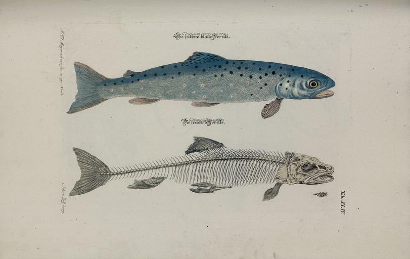 | Keywords: Meyer Zeit-Vertreib 1 Tafel 044.jpg Angenehmer und nützlicher Zeit-Vertreib mit Betrachtung curioser Vorstellungen allerhand kriechender fliegender und schwimmender auf dem Land und im Wasser sich befindender und nährender Thiere sowohl nach ihrer Gestalt und äusserlichen Beschaffenheit als auch nach der accuratest davon verfertigten Structur ihrer Scelete oder Bein-Cörper nebst einer deutlichen so physicalisch und anatomisch besonders aber osteologisch und mechanischen Beschreibung derselben / nach der Natur gezeichnet gemahlet in Kupfer gestochen und verlegt von Johann Daniel Meyer Miniatur-Mahler in Nürnberg; Band 1; Nürnberg 1748<br /> Tafel 44 Forelle http //resolver sub uni-goettingen de/purl PPN624674746 1748 Creator Johann Daniel Meyer PD-old-100 Angenehmer und nützlicher Zeit-Vertreib 1 Meyer Salmo trutta Fish skeletons |