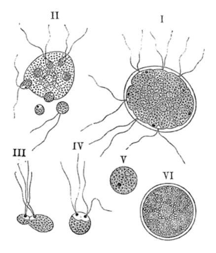 | Keywords: Meyers b1 s0342 b2.png de Entwicklung von Pandorina I “ schwärmende Familie II “ geschlechtliche Familie von welcher einzelne Zellen aus der Hülle austreten III “ zwei sich paarende Schwärmer IV “ dieselben nach ihrer Vereinigung V “ eben entstandene Z VI “ ausgewachsene Zygospore Meyers b1 s0342 jpg ca 1885 author PD-Meyers Pandorina Chlorophyta diagrams Images from Meyers Konversationslexikon 4th edition - text figures | ||||