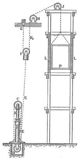 | Keywords: Meyers b2 s0072 b1.png de indirekt wirkender hydraulischer Aufzug A Plungerkolben B Hebezylinder C zwei lose Kettenrollen D zwei feste Gegenrollen E Befestigung von K F lose Rolle G Befestigung von K<sub>1</sub> H J feste Rollen K Kette K<sub>1</sub> zweite Kette L Leitbäume P Fördergestell Meyers b2 s0072 jpg ca 1885 author PD-Meyers Elevators Hydraulic engineering Images from Meyers Konversationslexikon 4th edition - text figures | ||||