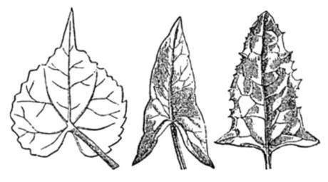 Keywords: Meyers b2 s1014 b3.png de links herzförmiges Blatt Mitte pfeilförmiges Blatt rechts spießförmiges Blatt Meyers b2 s1014 jpg ca 1885 author PD-Meyers Leaf diagrams Images from Meyers Konversationslexikon 4th edition - text figures
