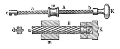 | Keywords: Meyers b3 s0151 b1.png de Drill- oder Druckbohrer A B a “ gedrehte Stahlstange b “ Schraubengänge d “ Triebstahl Querschnitt e “ Ende mit HĂĽlse s “ Ende mit Knopf K m “ Mutter r “ Stifte Meyers b3 s0151 jpg ca 1885 author PD-Meyers Hand-powered drills Images from Meyers Konversationslexikon 4th edition - text figures |