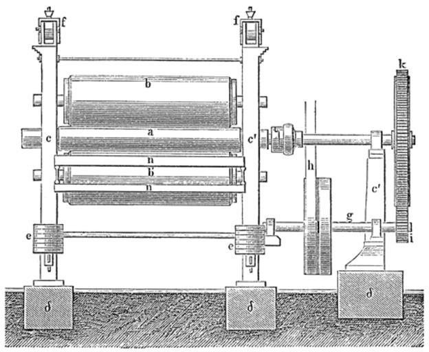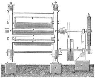 | Keywords: Meyers b9 s0376 b1.png de dreiwelliger Kalander ca 1885 Meyers b9 s0376 jpg author <gallery> Meyers b9 s0377 b1 png Durchschnitt </gallery> PD-Meyers Pulp and paper mill machines Images from Meyers Konversationslexikon 4th edition - text figures |