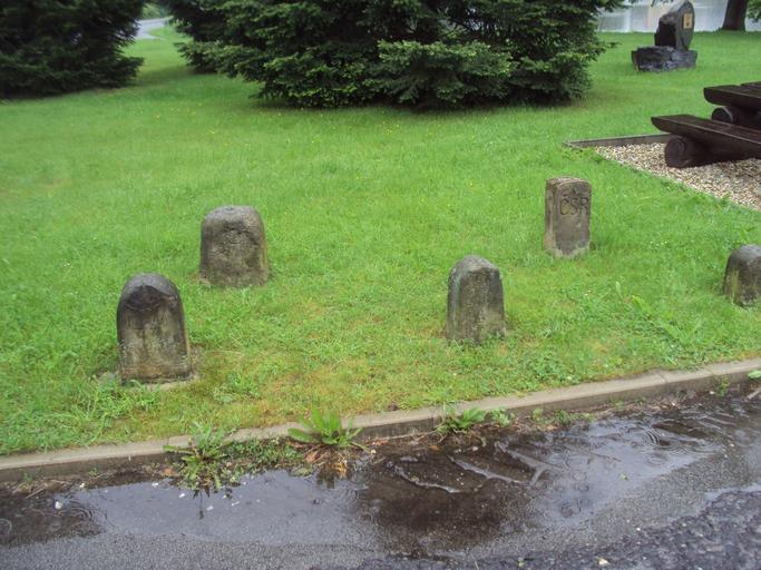 Keywords: Mezníky Hradčany 2.JPG cs Minivýstavka hraničních kamenů obec Hradčany trávník před Infostřediskem own Zákupák 2013-06-01 Hradčany Ralsko Boundary stones in the Czech Republic