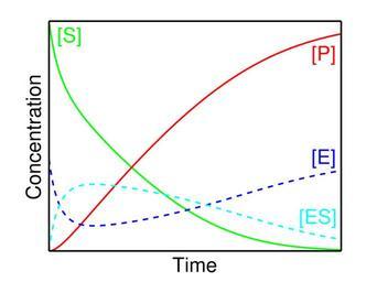 | Keywords: Michaelis Menten S P E ES.svg Michaelis “Menten kinetics parameter values used were k<sub>f</sub> 0 001 k<sub>r</sub> 0 0001 k<sub>cat</sub> 0 1 S<sub>0</sub> 500 E<sub>0</sub> 200 P<sub>0</sub> ES<sub>0</sub> 0 evaluated to t 50 as in http //se wtb tue nl/sewiki/biological_systems/man this example own U+003F 2011-07-29 Cc-zero Enzyme kinetics |