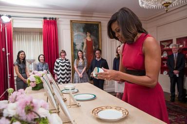 | Keywords: obama china service obamachinaservice white house china whitehousechina pickard china pickardchina 2015 white house china 2015whitehousechina porcelain american porcelain americanporcelain white house porcelain whitehouseporcelain obama porcelain obamaporcelain indoor First Lady Michelle Obama inspects the new White House china in the China Room of the White House in Washington, D.C., in the United States on April 27, 2015. This photograph was taken by Amanda Lucidon, a photographer in the employ of the White House. As the work of an employee of the federal government created in the performance of his/her duties, it is in the public domain. The White House must order new china about once every 10 years, depending on wear and tear. Recent past colors have included celadon green (Truman), white (with flowers; Johnson), red (Reagan), gold (Clinton), and gold (G.W. Bush). Although dark blue has been used on previous orders of White House china (both the F.D. Roosevelt and Wilson services used it), the type of light blue used by the Obamas has never been used before on American state china. The new Obama service porcelain was designed by First Lady Michelle Obama, with assistance from her friend, the interior designer Michael S. Smith. Planning for the new china began in the fall of 2011, and Obama consulted White House chefs (past and present), White House staff, and the Pickard China company of Illinois on the design and style of the porcelain, pieces, and color. White House dinners are growing ever-larger in size. Existing White House china settings are often used together, mixed and matched so that 400-, 500-, and even 600-setting dinners can be given. Michelle Obama was constrained by the need to design a china service that mixed well with existing china, but which reflected the Obamas' own personal style and tastes. The Obama china service made its debut on April 27, 2015. It was first used on April 28 for a state dinner for Japanese Prime Minister Shinzo Abe. Each setting has 11 pieces and there are 320 settings, for a total of 3,520 pieces in the entire service. The "service plate" or "charger" is the largest piece in the set at 14 inches. A charger is designed to be a placeholder, so that each diner knows to "sit here". As the meal is served, additional elements of the service are placed atop the charger. The charger helps protect the tablecloth from spills, but it also helps act as an aesthetic backdrop to the other pieces of china. The Obama chargers feature a lip of gold gilt, impressed with a fret (Greek key pattern). There is a narrow band of plain gilt on the rim next to the lip, with the rest of the rim in fluted gold gilt. A narrow band of plain gold gilt is placed just inside the well. In the center of the charger is the Presidential coat of arms in gold. The seal should be the first thing the diner sees when they are seated. Each dinner plate is 12 inches in diameter. The lip of the dinner plate is plain gold gilt. The broad rim of the plate lacks gilding or color, and is decorated with pinwheels and fronds in bas-relief. The bas-relief design was taken from an Empire-style china service purchased by then-Secretary of State James Madison in 1806. The bas-relief element is unique to White House china, which has never featured anything like it before. The Obama china service also includes a "second course" 11-inch dinner plate, a 10-inch luncheon plate, a 9-inch salad plate, a 9-inch dessert plate, a 7-inch tureen plate, and a 6-inch saucer. Each of these plates has a lip in gold gilt, impressed with a fret-oval-and-dart motif. Each motif is separated by a double row of dots. The rim of the plate is in a new color designed specifically for the Obama china service. This color is named "Kailua Blue," a bright blue inspired by the hue of the sea in President Barack Obama's home state of Hawaii. The fluted rim of blue is followed by a delicate inner line of gold gilt which completes the decoration. Only about half the rim is taken up by design and color. The dessert plate, the last plate the diner should see, also has the Presidential coat of arms in gold gilt in the center. Each setting comes with a coffee cup. The cup has a lip of plain gold gilt, followed by a narrow band of gold gilt in a dart-oval-dart motif set perpendecular to the lip. This is followed by a band of fluted Kailua blue, and then a delicate band of plain gold gilt again. Each cup has the Presidential coat of arms; if held by the right hand, the coat of arms faces the guest. Unique to the Obama china service is an individual tureen. Although large tureens have been part of White House china before, this is the first time an individual-sized tureen has been designed. The tureen reflects a more modern style of dining, which emphasizes soups, small entrees, or desserts requiring more than a bowl but not a large tureen. Each tureen is small, about 6 inches across. Handles on the side of the tureen are plain, consisting of a scroll with one acanthus leaf above and three below (helping to reinforce the scroll). Each tureen is about 4 inches deep. The lip of the tureen is plain. The rim is designed with the same plain pinwheels-and-fronds design in bas-relief. Below the rim, the side of the tureen is decorated with a narrow band of Kailua blue edged in a delicate line of gold gilt. The lid of the tureen is plain, with a mushroom-motif handle. The cap of the mushroom is fluted, with a botton topping the cap. Pickard China produced the dinnerware. The tureen was incredibly difficult to make. It took workers more than a year and innumerable trials to produce the tureen. The china service was paid for by the White House Historical Association -- a private foundation established by Jacqueline Kennedy to buy furniture, china, and decorative and fine art for the White House. The service cost $367,258. First Lady Michelle Obama inspects the new White House china in the China Room of the White House in Washington,