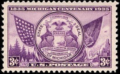 | Keywords: Michigan centenary 1935 U.S. stamp.1.jpg en Michigan celebrated the 100th anniversary of its campaign for statehood on November 1 1935 although it was admitted to the Union on January 26 1837 The 3-cent stamp features the Michigan state seal flanked by a forest scene and an urban industrial scene 2014-04-08 11 54 35 Arago people postage the post online National Postal Museum Bureau of Printing and Engraving PD-USGov Uploaded with UploadWizard U S territories on stamps Stamps of the United States 1931-1940 Purple stamps |