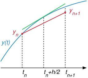| Keywords: Midpoint method illustration.png Illustration of Midpoint method own Oleg Alexandrov Created with MATLAB Source code MATLAB <source lang matlab > illustration of numerical integration compare the Forward Euler method which is globally O h with Midpoint method which is globally O h 2 and the exact solution function main f inline '2-y' 't' 'y' ; will solve y' f t y a 0; b 1; endpoints of the interval where we will solve the ODE A -0 5 b; B 1 5 b; a bit of an expanded interval N 2; T linspace a b N ; h T 2 -T 1 ; the grid y0 1; initial condition One step of the midpoint method Y solve_ODE N f y0 h T 2 ; midpoint method exact solution to the right hh 0 05; TT a hh B; NN length TT ; YY solve_ODE NN f y0 hh TT 2 ; midpoint method exact solution to the left TTl a hh -A ; NN length TTl ; ZZ solve_ODE NN f y0 -hh TTl 2 ; midpoint method the tangent line at the midpoint tmid a+b /2; I find TT > tmid ; m I 1 ; tmid TT m ; ymid YY m ; slope f tmid ymid ; Tan_l 0 5 b; Tant tmid-Tan_l hh tmid+Tan_l ; Tany slope Tant-tmid +ymid; prepare the plotting window lw 3; curves linewidth lw_thin 2; thinner curves fs 30; font size figure 1 ; clf; hold on; axis equal; axis off; colors red 0 867 0 06 0 14; blue 0 129 205/256; green 0 200 70/256; black 0 0 0; coordinate axes shifty 0 2; arrowsize 0 1; arrow_type 1; angle 20; in degrees arrow A shifty B shifty lw_thin arrowsize angle arrow_type black plot auxiliary lines I find TT > a ; m I 1 ; ya YY m ; plot a a 0+shifty ya 'linewidth' lw_thin 'linestyle' '--' 'color' black I find TT > tmid ; m I 1 ; ymid YY m ; plot tmid tmid 0+shifty ymid 'linewidth' lw_thin 'linestyle' '--' 'color' black I find TT > b ; m I 1 ; yb YY m ; plot b b 0+shifty yb 'linewidth' lw_thin 'linestyle' '--' 'color' black plot the solutions plot TT YY 'color' blue 'linewidth' lw ; plot -TTl ZZ 'color' blue 'linewidth' lw plot T Y 'color' red 'linewidth' lw plot the tangent line plot Tant Tany+0 003 lw 'color' green 'linewidth' lw smallrad 0 02; ball T 1 Y 1 smallrad red ball T length T Y length Y smallrad red text small 0 15; text a shifty-small '\it t_n ' 'fontsize' fs text tmid shifty-small '\it t_n+h/2 ' 'fontsize' fs text b shifty-small '\it t_ n+1 ' 'fontsize' fs text T 1 -1 5 small Y 1 '\it y_n ' 'fontsize' fs 'color' red text T length T +0 6 small Y length Y '\it y_ n+1 ' 'fontsize' fs 'color' red text -TTl length TTl +0 1 small ZZ length ZZ +3 small '\it y t ' 'fontsize' fs 'color' blue axes aspect ratio pbaspect 1 1 5 1 ; save to disk saveas gcf sprintf 'Midpoint_method_illustration eps' h 'psc2' ; function Y solve_ODE N f y0 h T method Y 0 T; Y 1 y0; for i 1 N-1 t T i ; y Y i ; if method 1 forward Euler method Y i+1 y + h f t y ; elseif method 2 explicit one step midpoint method K y + 0 5 h f t y ; Y i+1 y + h f t+h/2 K ; else disp 'Don`t know this type of method' ; return; end end function arrow start stop thickness arrow_size sharpness arrow_type color Function arguments start stop start and end coordinates of arrow vectors of size 2 thickness thickness of arrow stick arrow_size the size of the two sides of the angle in this picture -> sharpness angle between the arrow stick and arrow side in degrees arrow_type 1 for filled arrow otherwise the arrow will be just two segments color arrow color a vector of length three with values in 0 1 convert to complex numbers i sqrt -1 ; start start 1 +i start 2 ; stop stop 1 +i stop 2 ; rotate_angle exp i pi sharpness/180 ; points making up the arrow tip besides the stop point point1 stop - arrow_size rotate_angle stop-start /abs stop-start ; point2 stop - arrow_size/rotate_angle stop-start /abs stop-start ; if arrow_type 1 filled arrow plot the stick but not till the end looks bad t 0 5 arrow_size cos pi sharpness/180 /abs stop-start ; stop1 t start+ 1-t stop; plot real start stop1 imag start stop1 'LineWidth' thickness 'Color' color ; fill the arrow H fill real stop point1 point2 imag stop point1 point2 color ; set H 'EdgeColor' 'none' else two-segment arrow plot real start stop imag start stop 'LineWidth' thickness 'Color' color ; plot real stop point1 imag stop point1 'LineWidth' thickness 'Color' color ; plot real stop point2 imag stop point2 'LineWidth' thickness 'Color' color ; end function ball x y r color Theta 0 0 1 2 pi; X r cos Theta +x; Y r sin Theta +y; H fill X Y color ; set H 'EdgeColor' 'none' ; </source> Images with Matlab source code Numerical analysis Files by User Oleg Alexandrov from en wikipedia math |