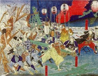 | Keywords: Mie kenka Shomin bodo no Jiken.jpg en This is a scene of Riot of Ise or Ise Bodo in 1876 This picture was painted by Yoshitoshi Tsukioka ja 1876年(明治9年)に発生した伊勢暴動の様子 岡芳年筆 佐 寬司・ 立道久 高等学校 日 史A 改訂版 清水書院 平成20年2 15日再販発行 平成18年3 20日文部科学 定済 高等学校 理歴史科 35 清水 日A 09 ISBN 978-4-389-60010-5 59ページに掲載 en Early era of Meiji about 1876 - 1890 ja 明治 en Yoshitoshi Tsukioka ja 岡芳年 Other fields Information field ucfirst location/i18n en The vicinity of Kumozu Ichishi Mie Japan Now it is in Tsu city ja 三重 志郡雲出付近(現・津市) Ono Japanese axe Otsuchi war mallet Tsukioka Yoshitoshi 1876 Tsu Mie Riots in Japan PD-Japan |