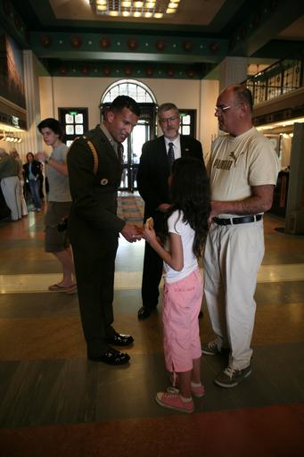 View Original:Military_Aide_Lieutenant_Colonel_David_Jones_and_David_Addington_Greet_a_Father_and_Daughter_in_Lobby_of_King_David_Hotel_in_Jerusalem.jpg (-4368x2912)