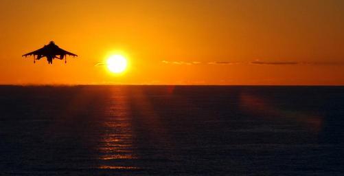 Keywords: military aircraft take off silhouette sunset plane jet airplane harrier us navy sun sea sky orange flying