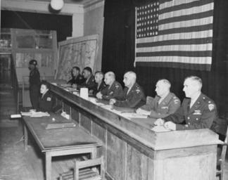 | Keywords: Military Tribunal-Dora-Mittelbau.jpeg en The judges comprising the American Military Tribunal which presided over the Dora-Mittelbau war crimes trial The officers' names from left to right are Major W M Vanderburgh Lt Colonel L S Tracy Colonel Joseph W Benson Colonel Frank Silliamn III Lt Colonel David H Thomas Colonel Claude O Bunch and Lt Colonel Roy J Herte Locale Dachau Bavaria Germany Credit USHMM courtesy of National Archives and Records Administration College Park Photograph 43066 Author 1947-09-25 Copyright Public Domain On August 7 1947 an American Military Tribunal in Dachau Germany brought to trial nineteen former camp personnel and prisoners from the Dora-Mittelbau concentration camp system including a number of its sub-camps All of the defendants were charged with beating and killing inmates as well as with indulging in acts of personal sadism against them Some specific charges were also raised against individual defendants Shortly after the defense opened its case on October 25 the four kapos among the accused testified against their fellow defendants providing additionally incriminating evidence The tribunal's findings were announced on December 24 and all but four of the defendants were found guilty Following Christmas sentences were announced on 30 December with former SS-Obersturmfuehrer Hans Karl Moeser being the only man sentenced to death Seven others were sentenced to life in prison while the rest received various jail terms Every one of the defendants with the exception of one person was released after serving only from seven to ten years Moeser was executed in June 1948 PD-USGov Andrae Trial |
