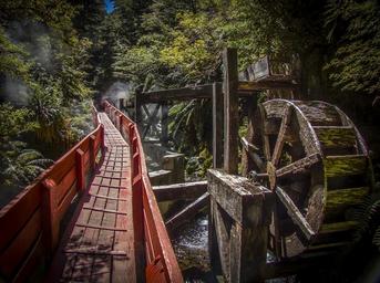 Keywords: mill wheel hot springs bridge nature landscape south chile