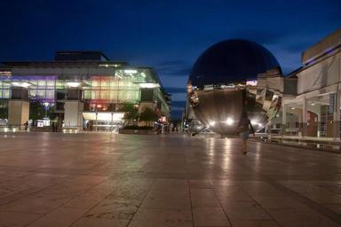 Keywords: millenium space bristol england planetarium glass aluminium mirror shiny metal architecture reflection ball homes urban evening night dark blue mirroring paving stones facade lighting colorful art modern