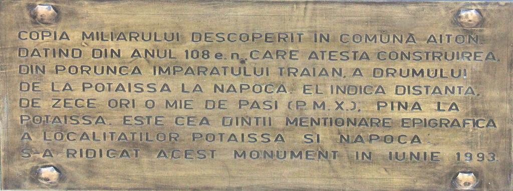| Keywords: Milliarum of Aiton, plaque of the modern copy erected in Turda, Romania in 1993.jpg milliarium discovered in Aiton commune near Cluj-Napoca Romania dating from 108 AD and showing the construction of the road from Potaissa to Napoca by demand of the Emperor Trajan It indicates the distance of ten thousand feet P M X to Potaissa It is the first epigraphical attestation of the settlements of Potaissa and Napoca in Roman Dacia This monument was erected in June 1993 in front of the Turda Post Office Dec 1 1918 Street The complete inscription is Imp erator / Caesar Nerva/ Traianus Aug ustus / Germ anicus Dacicus/ pontif ex maxim us / sic pot estate XII co n s ul V/ imp erator VI p ater p atriae fecit/ per coh ortem I Fl aviam Vlp iam / Hisp anam mil liariam c ivium R omanorum eq uitatam / a Potaissa Napo/cam / m ilia p assuum X The inscription was recorded in Corpus Inscriptionum Latinarum vol III the 1627 Berlin 1863 es Reproducción moderna con el texto de CIL III 1627 procedente de Aiton RumanÃa que reza Imp erator / Caesar Nerva/ Traianus Aug ustus / Germ anicus Dacicus/ pontif ex maxim us / sic pot estate XII co n s ul V/ imp erator VI p ater p atriae fecit/ per coh ortem I Fl aviam Vlp iam / Hisp anam mil liariam c ivium R omanorum eq uitatam / a Potaissa Napo/cam / m ilia p assuum X comuna Aiton datând din anul 108 e n care atestă construirea din porunca împăratului link Traian ro a drumului de la Potaissa la Napoca El indică distanÈ›a de zece ori o mie de paÈ™i P M X până la Potaissa Este cea dintîi menÈ›ionare epigrafică a localităților Potaissa È™i Napoca Acest monument a fost ridicat în iunie 1993 în faÈ›a PoÈ™tei din Turda strada 1 Decembrie 1918 InscripÈ›ia completă este Imp erator / Caesar Nerva/ Traianus Aug ustus / Germ anicus Dacicus/ pontif ex maxim us / sic pot estate XII co n s ul V/ imp erator VI p ater p atriae fecit/ per coh ortem I Fl aviam Vlp iam / Hisp anam mil liariam c ivium R omanorum eq uitatam / a Potaissa Napo/cam / m ilia p assuum X InscripÈ›ia a fost înregistrată în žCorpus Inscriptionum Latinarum vol III textul 1627 Berlin 1863 own 2006-06-07 User CristianChirita 46 34 8 84 N 23 47 9 37 E region RO Plaques in Turda Inscriptions in Turda Roman Dacia Milliarium of Aiton |