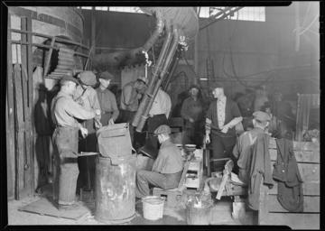 | Keywords: "Millville, New Jersey - Glass bottles - T.C. Wheaton Co. Green glass monkey shop" - NARA - 518642.tif Scope and content Millville New Jersey - Glass bottles T C Wheaton Co Green glass monkey shop This shows the set-up of a green glass blowing shop Monkey shops are said to be the same as the others but the bottles are smaller and the work must be done much more rapidly The two men standing up at the left hand side of the picture facing front are blowers Two always work together in a shop of this kind They take the glass from the oven and drop it in a mould which in this case is in front of the man who is sitting down in the center of the picture A blower at the right is rolling the glass on an iron sheet getting it ready to blow The one at the left with the cheeks distorted is blowing a bottle The laborer to the left of this blower takes the blow rods after the blower is finished with them knocks of the excess glass and hands them back to the first blower again The shutting mould boy seated in the center of the picture opens the mould and puts the glass bottle on the scales to his right They are then General notes 518642 Local identifier 69-RP-415 Federal Works Agency Work Projects Administration National Research Project ca 1941 - ca 1942 NARA-Author Hine Lewis Wickes 1874-1940 Photographer 1122914 <br /> Millville Cumberland New Jersey United States North and Central America inhabited place 3354813 39 4 -75 033 <br /> Still Picture Records Section Special Media Archives Services Division NWCS-S National Archives at College Park 8601 Adelphi Road College Park MD 20740-6001 1937-03-26 Record group Record Group 69 Records of the Work Projects Administration 1922 - 1944 Record group ARC 398 Lewis Hine Photographs for the National Research Project compiled 1936 - 1937 Series ARC 518291 File unit File unit ARC Variant control numbers NAIL Control Number NWDNS-69-RP-415 yes Other versions <gallery> File Millville _New_Jersey_-_Glass_bottles_-_T C _Wheaton_Co _Green_glass_monkey_shop _-_NARA_-_518642 tif tif File Millville _New_Jersey_-_Glass_bottles_-_T C _Wheaton_Co _Green_glass_monkey_shop _-_NARA_-_518642 jpg jpg </gallery> NARA-cooperation PD-USGov Millville New Jersey glassworking industry Glass industry in the United States NARA TIF images with categorized JPGs |