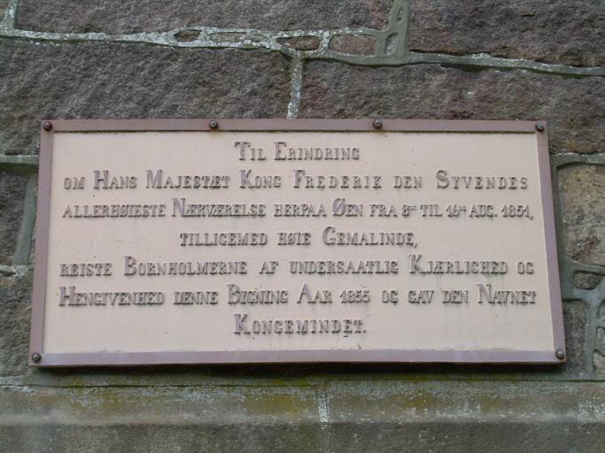 Keywords: Mindeplade kongemindet.jpg Dansk Mindepladen på Kongemindet Rytteknægten Bornholm own Photo by author 2006-08-02 Danielle Keller Danielle_dk Public Domain Plaques in Denmark Rytterknægten Monuments and memorials to Frederick VII of Denmark