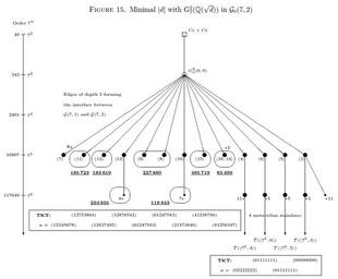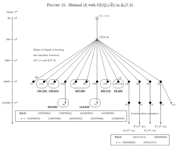 | Keywords: MinDiscriminantsCoclass2Type77Sporadic.png This diagram shows the interface between the graphs of finite 7-groups with coclass 1 and 2 and abelianization of type 7 7 Important vertices are labelled with their SmallGroups Library identifier in angle brackets The vertices 11 12 846 9 8 854 15 16 and 14 are most densely populated by second 7-class groups of complex quadratic fields with discriminant d<0 The underlined counters adjacent to the ovals surrounding these vertices give the minimal absolute discriminants of the distribution TKT means transfer kernel type <br/> User DanielConstantinMayer added png file MinDiscriminantsCoclass2Type77Sporadic User DanielConstantinMayer gave a wrong SmallGroup identifier <3 7 13> instead of the correct <7 5 13> in the comment of November 1 2014 The distribution was computed by myself User DanielConstantinMayer 2014-10-18 DanielConstantinMayer talk Uploads This file has been updated and corrected by a tiff file with identifier MinDiscriminantsCoclass2Type77Sporadic tiff DanielConstantinMayer wikipedia en Cc-zero Original upload log en wikipedia MinDiscriminantsCoclass2Type77Sporadic png wikitable - 2014-11-01 17 45 909×752× 86319 bytes DanielConstantinMayer The TKT for <3 7 13> was missing and the multiplicities of batches were incorrect - 2014-10-18 17 35 838×747× 93885 bytes DanielConstantinMayer User DanielConstantinMayer added png file MinDiscriminantsCoclass2Type77Sporadic Uncategorized 2016 May 5 |