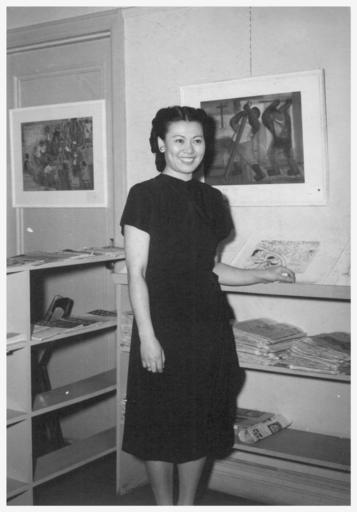 | Keywords: Miné Okubo paused to have this picture taken (G-828).jpg en Miss Mine Okubo Nisei who resettled to New York from the Topaz Center paused to have this picture taken while greeting friends at a tea in her honor at the opening of an exhibit of her drawings and paintings of center life at the American Common in New York City on March 6 under the auspices of the Common Council for American Unity Miss Okubo came East in 1944 to serve as contributing artist to Fortune Magazine's special issue on Japan She has also contributed to the New York Times Saturday Review of Literature Survey Graphic and Lamp She recently completed a manuscript for a book about the evacuation of Japanese Americans from the West Coast Born in Riverside Calif her art work has been widely exhibited on the West Coast where she won several prizes The University of California awarded her the B A and M A degrees and in 1938 its highest art honor--the Bertha Henioke Taussig Memorial Traveling Fellowship On this she studied for two years in Europe She returned to this country when the war started and began work almost immediately at the Golden Gate Fair demonstrating fresco painting She was evacuated to the Tanforan Center in May 1942 and taught art for six months At Central Utah she was on the staff of the Topaz Times and art editor of Trek Her father a married brother and family are at the Poston Center Another brother teaches art at Heart Mountain A married sister and family resettled in Brooklyn N Y Two other brothers are in the U S Army--Pvt Senji who recently returned from France with the Purple Heart after service with the 442nd Regimental Combat Team and Pfc Toku who is stationed at Fort Snelling Minn -- Photographer Fujihira Toge -- New York New York 3/6/45<br />Identifier Volume 40 Section J<br />WRA no G-828<br />War Relocation Authority Photographs of Japanese-American Evacuation and Resettlement Series 12 Relocation new homes etc various places <br />Courtesy of UC Berkeley Bancroft Library 1945-03-06 UC Berkeley Bancroft Library via the http //content cdlib org/ark /13030/ft996nb5q6/ Online Archive of California Fujihira Toge other versions PD-USGov Miné Okubo Uploaded with UploadWizard |