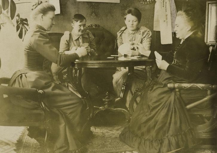 | Keywords: Minnan salonki skruuvipoyta.jpg en Finnish author Minna Canth's famous salon Ladies playing cards From left Hanna Levander Alma Tervo Maiju and Minna Canth fi Minnan salongissa pelataan skruuvia Vasemmalta Hanna Levander Alma Tervo Maiju ja Minna Canth http //www minnansalonki fi/items/show/886 Minnansalonki fi between 1881 1897 Author anonymous-EU Minna Canth Kanttila Building interiors in Kuopio | ||||