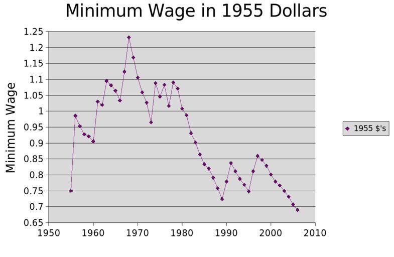 Keywords: Minwage3.png Graph of minimum wage adjusted to 1955 Dollars Created by me based on the data at the US Department of Labor and some math I got from some people on freenode 2006-12-07 own assumed Bluefoxicy Minimum wage