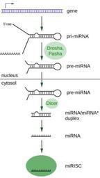 | Keywords: MiRNA processing.svg Overview of microRNA processing from transcription to the formation of the effector complex Abbrevations <br>pri-miRNA primary microRNA transcript<br>pre-miRNA precursor microRNA <br>miRNA microRNA <br>miRNA antisense microRNA <br>miRISC microRNA-induced silencing complex Vector version of w Image MiRNA processing JPG made by Narayanese after an http //www nature com/nrc/journal/v6/n4/fig_tab/nrc1840_F1 html illustration in cite journal Esquela-Kerscher A Slack FJ Oncomirs ” microRNAs with a role in cancer 2006 6 259 “69 Nature Reviews Cancer 10 1038/nrc1840 2008-04-07 Narayanese vectorized by Fvasconcellos Genetic diagrams MicroRNAs |
