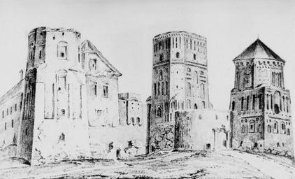 Keywords: Mirski zamak. Мірскі замак (1849).jpg і Mir Замак Ільлінічаў Радзівілаў Illinič Radzivił зь пе адб ам'ем Літаг афія з малюнка Ф Сабешанскага Ва шава 1849 Tadeusz Chrzanowski Kresy czyli obszary tęsknot Kraków 2001 Franciszek Maksymiliann Sobieszański 1849 PD-old-100 Mir Castle in art History of Mir