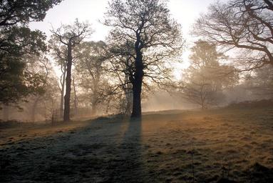 Keywords: misty morning sunrise trees serene peaceful fog