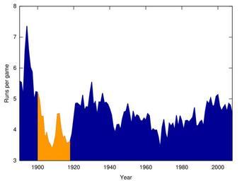 | Keywords: MLB runspergame history.svg en Historical major league baseball runs scored per game by a single team ; highlighted area is the dead-ball era 1900-1918 inclusive Own Grabsomepine 2008-06-01 The data is league-wide; note that the American League data does not start until the creation of the American League in 1901 Historical Major League Baseball data is freely available from many sources online This data was taken from http //www baseball-reference com Baseball-Reference com http //www baseball-reference com/leagues/AL shtml http //www baseball-reference com/leagues/NL shtml The file was created in Gnuplot with the following code set terminal svg enhanced size 640 480 fname Helvetica fsize 12 set output MLB_runspergame_history svg set style line 1 linetype 1 pointtype 6 linewidth 2 linecolor 6 pointsize 2 set style line 2 linetype 1 pointtype 6 linewidth 2 linecolor 7 pointsize 2 set xrange 1890 2008 set ytics 0 1 8 set yrange 3 8 set format y 1 0f set xlabel Year set ylabel Runs per game unset key set boxwidth 1 0 relative set style fill solid 1 0 plot \ datafile1 w filledcurves x1 linestyle 1 \ datafile2 w filledcurves x1 linestyle 2 from the following data file Year R/G 1877 5 667 1876 5 896 1877 5 667 1878 5 174 1879 5 31 1880 4 693 1881 5 098 1882 5 41 1883 5 778 1884 5 501 1885 4 952 1886 5 237 1887 6 083 1888 4 538 1889 5 841 1890 5 575 1891 5 538 1892 5 097 1893 6 57 1894 7 363 1895 6 584 1896 6 032 1897 5 884 1898 4 956 1899 5 237 1900 5 213 1901 4 986 1902 4 432 1903 4 44 1904 3 726 1905 3 897 1906 3 617 1907 3 527 1908 3 385 1909 3 548 1910 3 835 1911 4 513 1912 4 527 1913 4 037 1914 3 745 1915 3 793 1916 3 564 1917 3 588 1918 3 634 1919 3 872 1920 4 361 1921 4 856 1922 4 87 1923 4 815 1924 4 761 1925 5 129 1926 4 637 1927 4 751 1928 4 73 1929 5 186 1930 5 549 1931 4 811 1932 4 913 1933 4 481 1934 4 906 1935 4 897 1936 5 188 1937 4 871 1938 4 893 1939 4 824 1940 4 68 1941 4 489 1942 4 083 1943 3 915 1944 4 168 1945 4 181 1946 4 007 1947 4 355 1948 4 579 1949 4 607 1950 4 852 1951 4 547 1952 4 176 1953 4 607 1954 4 376 1955 4 485 1956 4 452 1957 4 306 1958 4 283 1959 4 383 1960 4 314 1961 4 525 1962 4 461 1963 3 947 1964 4 036 1965 3 988 1966 3 994 1967 3 769 1968 3 418 1969 4 072 1970 4 342 1971 3 889 1972 3 686 1973 4 214 1974 4 125 1975 4 213 1976 3 995 1977 4 471 1978 4 103 1979 4 458 1980 4 288 1981 3 998 1982 4 298 1983 4 308 1984 4 257 1985 4 331 1986 4 409 1987 4 723 1988 4 138 1989 4 132 1990 4 256 1991 4 308 1992 4 117 1993 4 598 1994 4 923 1995 4 847 1996 5 036 1997 4 767 1998 4 79 1999 5 085 2000 5 14 2001 4 775 2002 4 618 2003 4 728 2004 4 814 2005 4 592 2006 4 858 2007 4 797 2008 4 493 Major League Baseball diagrams Statistical charts Images with Gnuplot source code |