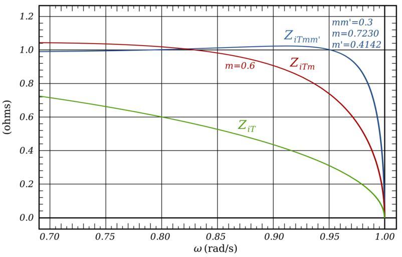 | Keywords: Mm'-Derived Low-pass Image Impedance.svg image impedances of prototype low-pass mm'-derived filter m-derived filter and constant-k filter in the region immediately below <var>ω</var> <var>ω</var><sub>c</sub> 1 The parameters of the mm'-derived filter are <var>m</var> 0 7230 <var>m'</var> 0 4124 <var>mm'</var> 0 3 The parameter of the m-derived filter is <var>m</var> 0 6 These filters both have the optimum impedance matching for their types <math>Z_ iT mm' \frac \sqrt 1-\omega 2 \left 1- 1-m 2 \omega 2 \right 1-\left \omega/\omega_\infin\right 2 </math> where <math>\omega_\infin \frac \omega_c \sqrt 1- mm' 2 </math> <math>Z_ iT m \frac \sqrt 1-\omega 2 1-\left \omega/\omega_\infin\right 2 </math> where <math>\omega_\infin \frac \omega_c \sqrt 1-m 2 </math> <math>Z_ iT \sqrt 1-\omega 2 </math> own 2009-11-26 Inductiveload Mathematica Code <pre><nowiki> wc 1; mm'-derived m1 0 7230; m2 0 4134; mm m1 m2; winfmm wc/Sqrt1 - mm 2; zitmmw_ Sqrt1 - w 2 1 - 1 - m1 2 w 2 / 1 - w/winfmm 2 ; m-derived m 0 6; winfm wc/Sqrt1 - m 2; zitmw_ Sqrt1 - w 2/ 1 - w/winfm 2 ; constant-k zitw_ Sqrt1 - w 2 Plot zitmmw zitmw zitw w 0 6 1 PlotRange -> All </nowiki></pre> M-Derived filters Mm'-Derived filters Constant-k filters Image impedance |