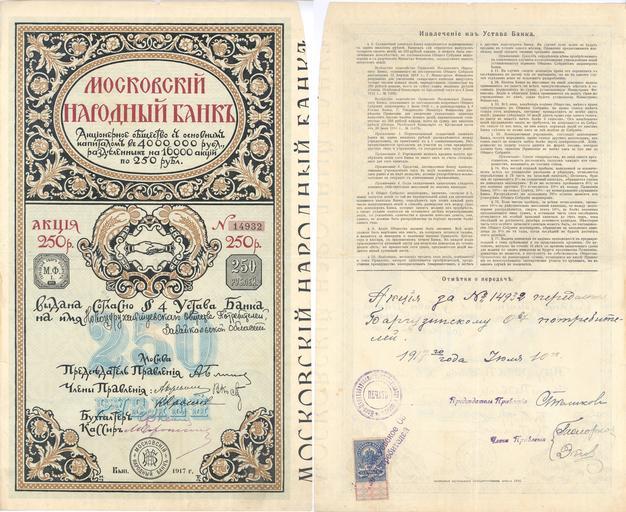 | Keywords: MNB-share4.jpg en Stock certificate of the Moskovskaya Narodnaia Banka Moscow People's Bank of 250 rubles Released in 1917 at the name of the Company Novotsurukhaytuevkovo Consumers Trans-Baikal region On the the reverse side some endorsements ru Акция осковского а одного Банка на 250 уб выпуска 1917 года на имя овоцу ухайтуевкого Общества Пот ебителей Забайкальской области и обо отная сто она с пе едаточной надписью own Original upload SenchenkoVladimir 1917 Stock certificates from Russia Banks in Russia Defunct companies of Russia PD-art |