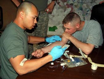 | Keywords: MND-B Soldiers improve CLS skills DVIDS92430.jpg en Sgt Ryan Blas left military police Soldier 18th Military Police Brigade and native of Chalan Pago Guam successfully inserts an IV into Spc Brandon Nethken's arm as the Soldiers from the 18th MP Bde 's Personal Security Team participate in a Combat Lifesavers Course held on Camp Victory Iraq June 3 U S Army Soldiers are instructed on how to perform basic medical care techniques in case the need arises under emergency conditions in order to take care of their fellow Soldier U S Army photo/Maj Michael Indovina 18th Military Police Brigade 2008-06-03 https //www dvidshub net/image/92430 92430 2008-06-04 12 32 BAGHDAD IQ PD-USGov Camp Victory Images from DoD uploaded by Fæ |
