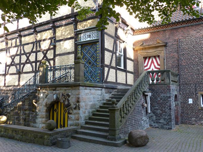 Keywords: moated castle places of interest castle park architecture gladbeck building witt rings truss bar construction wood facade fachwerkhaus home stairs staircase finish gradually door input front door