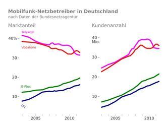 | Keywords: Mobilfunk-Netzbetreiber Deutschland.svg Marktanteil und Kundenanzahl der Mobilfunk-Netzbetriber in Deutschland Datenquelle http //www bundesnetzagentur de/cln_1931/DE/Sachgebiete/Telekommunikation/Marktbeobachtung/Mobilfunkteilnehmer/Mobilfunkteilnehmer_Basepage html Teilnehmerentwicklung im Mobilfunk der Bundesnetzagentur Stand Oktober 2011 own 2011-10-01 Zesel Cc-zero Statistics of Germany Mobile statistics | ||||