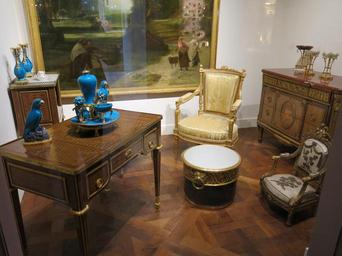 | Keywords: Mobilier de l'appartement de nuit de Marie-Antoinette aux Tuileries (Louvre).jpg en Furniture for the night appartment of the queen of France Marie-Antoinette in the Tuileries palace Louvre museum Paris France From left to right bedside table 1784 OA 10307 toilet table 1784 T 551C cabriole chair 1788 V 5357 basin for foot bath Sèvres porcelain child's straight-backed chair 1760 OA 6877 commode 1784 OA 10276 The blue objects are China porcelains of circa 1700 fauteuil en cabriolet accoudoirs évidés dossier concave 1788 V 5357 seau à laver les pieds porcelaine de Sèvres fauteuil d'enfant à la reine accoudoirs évidés dossier plat 1760 OA 6877 commode 1784 OA 10276 Les objets bleus sont des porcelaines de Chine datant de 1700 environ sf 2016-01-06 Tangopaso Decorative arts in the Louvre - Room 63 Collections of Marie Antoinette of Austria Furniture in Paris Louis XVI style furniture |