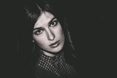 Keywords: model girl dress view beauty dark background fashion style jacket female emotions long hair photoshoot table hairstyle hair posture sitting cosmetics hands person