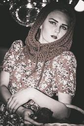 Keywords: model girl dress view beauty dark background fashion style jacket female emotions long hair photoshoot table hairstyle hair posture sitting cosmetics hands person
