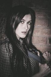 Keywords: model girl dress view beauty dark background fashion style jacket female emotions long hair photoshoot table hairstyle hair posture sitting cosmetics hands person