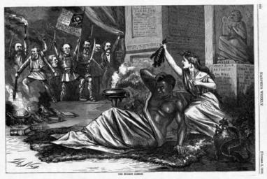 | Keywords: blackandwhite monochrome photo border surreal outdoor black and white Thomas Nast's cartoon &quot;The Modern Samson,&quot; 1868. Shows the Delilah of &quot;Southern Democracy&quot; (i.e. the southern Democratic party) at right displaying the cut hair of &quot;Suffrage&quot; to the approaching Philistines at left, while a black Samson figure slowly awakes. The caricatures of armed Democratic figures include (from left to right): Wade Hampton III with a torch held high; Nathan Bedford Forrest with a Fort Pillow Medallion; Robert E. Lee squatting; presidential nominee Horatio Seymour with hair shaped into horns, wearing a Ku Klux Klan breastplate, and carrying a flag that promotes slavery, the &quot;lost cause&quot; (the Confederacy), Civil War draft riots of New York City, the Ku Klux Klan, and the Reconstruction race riots in Memphis and New Orleans; wearing another Ku Klux Klan breastplate, current vice presidential nominee Frank Blair; former Confederate Rear Admiral Raphael Semmes; and 23rd New York Governor John Hoffman with a generic Catholic Irish-American under his arm. On the far right, a statue of President Andrew Johnson is likened to a &quot;Moses&quot; of the black Americans holding a tablet labeled &quot;veto&quot; to remind the audience of his recent Reconstruction legislation veto. Under the statue is a snake with horns similar to the hair of the depiction of Seymour, alluding to Satan. Opposite, on the left, a bonfire is depicted in front of them burning the Bible as well as various symbols of knowledge including books, a scroll, and a globe. Thomas Nast's cartoon "The Modern Samson," 1868. Shows the Delilah of "Southern Democracy" (i.e. the southern Democratic party) at right displaying the cut hair of "Suffrage" to the approaching Philistines at left, while a black Samson figure slowly awakes. The caricatures of armed Democratic figures include (from left to right): Wade Hampton III with a torch held high; Nathan Bedford Forrest with a Fort Pillow Medallion; Robert E. Lee squatting; presidential nominee Horatio Seymour with hair shaped into horns, wearing a Ku Klux Klan breastplate, and carrying a flag that promotes slavery, the "lost cause" (the Confederacy), Civil War draft riots of New York City, the Ku Klux Klan, and the Reconstruction race riots in Memphis and New Orleans; wearing another Ku Klux Klan breastplate, current vice presidential nominee Frank Blair; former Confederate Rear Admiral Raphael Semmes; and 23rd New York Governor John Hoffman with a generic Catholic Irish-American under his arm. On the far right, a statue of President Andrew Johnson is likened to a "Moses" of the black Americans holding a tablet labeled "veto" to remind the audience of his recent Reconstruction legislation veto. Under the statue is a snake with horns similar to the hair of the depiction of Seymour, alluding to Satan. Opposite, on the left, a bonfire is depicted in front of them burning the Bible as well as various symbols of knowledge including books, a scroll, and a globe. ModernSamson.jpg en Thomas Nast's cartoon The Modern Samson 1868 Shows the Delilah of Southern Democracy i e the southern Democratic party at right displaying the cut hair of Suffrage to the approaching Philistines at left while a black Samson figure slowly awakes <br> The caricatures of armed Democratic figures include from left to right Wade Hampton III with a torch held high; Nathan Bedford Forrest with a Fort Pillow Medallion; Robert E Lee squatting; presidential nominee Horatio Seymour with hair shaped into horns wearing a Ku Klux Klan breastplate and carrying a flag that promotes slavery the lost cause the Confederacy Civil War draft riots of New York City the Ku Klux Klan and the Reconstruction race riots in Memphis and New Orleans; wearing another Ku Klux Klan breastplate current vice presidential nominee Frank Blair; former Confederate Rear Admiral Raphael Semmes; and 23rd New York Governor John Hoffman with a generic Catholic Irish-American under his arm On the far right a statue of President Andrew Johnson is likened to a Moses of the black Americans holding a tablet labeled veto to remind the audience of his recent Reconstruction legislation veto Under the statue is a snake with horns similar to the hair of the depiction of Seymour alluding to Satan Opposite on the left a bonfire is depicted in front of them burning the Bible as well as various symbols of knowledge including books a scroll and a globe October 3rd 1868 Issue of Harpers Weekly Page 632 Creator Thomas Nast 1868 PD-old-100 1868 cartoons 1860s political cartoons of the United States 1868 in the United States Reconstruction Era Thomas Nast Samson and Delilah Thomas Nast's cartoon "The Modern Samson," 1868. Shows the Delilah of "Southern Democracy" (i.e. the southern Democratic party) at right displaying the cut hair of "Suffrage" to the approaching Philistines at left, while a black Samson figure slowly awakes. The caricatures of armed Democratic figures include (from left to right): Wade Hampton III with a torch held high; Nathan Bedford Forrest with a Fort Pillow Medallion; Robert E. Lee squatting; presidential nominee Horatio Seymour with hair shaped into horns, wearing a Ku Klux Klan breastplate, and carrying a flag that promotes slavery, the "lost cause" (the Confederacy), Civil War draft riots of New York City, the Ku Klux Klan, and the Reconstruction race riots in Memphis and New Orleans; wearing another Ku Klux Klan breastplate, current vice presidential nominee Frank Blair; former Confederate Rear Admiral Raphael Semmes; and 23rd New York Governor John Hoffman with a generic Catholic Irish-American under his arm. On the far right, a statue of President Andrew Johnson is likened to a "Moses" of the black Americans holding a tablet labeled "veto" to remind the audience of his recent Reconstruction legislation veto. Under the statue is a snake with horns similar to the hair of the depiction of Seymour, alluding to Sata