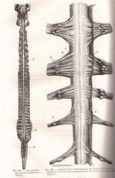 | Keywords: MoelleEpinChauveau1890MeyCh.jpg en The spinal cord of the horse Equus caballus fr La moelle épinière du cheval Equus caballus <br /> Fig 325 Vue générale A renflement cervical B renflement lombaire C nerfs de la queue de cheval <br /> Fig 326 Détail au niveau du renflement cervical <br /> A racines supérieures B racines inférieures C D ganglions rachidiens E dure-mère <br /> ” Chauveau Auguste Arloing Saturnin Traité d'anatomie comparée des animaux domestiques <br /> 1 064 p page 756 1890 Paris Lib J B Baillière et Fils domaine public décès des auteurs 1917 et 1911 Meyer Ch 2011-04-05 PD-old Horse nervous system |